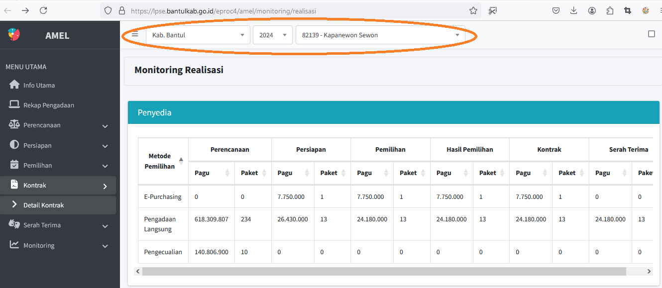 Untuk mengetahui realisasi Pengadaan Barang dan Jasa Kapanewon Sewon tahun berjalan, silakan kunjungi link yang kami cantumkan di bawah dengan petunjuk sebagai berikut.